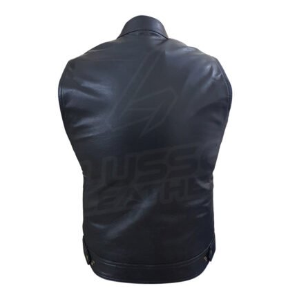 Black biker leather vest Assymetrical zipper lining Notch lapels with press studs Shoulder epaullets Belt on waist 100% real sheep